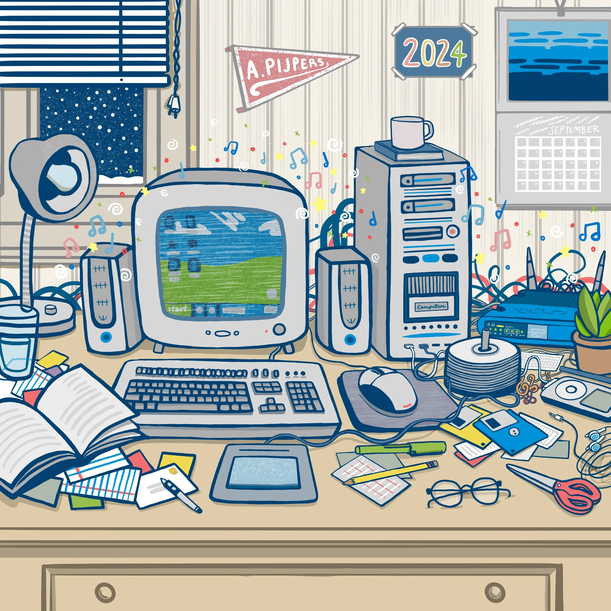 I started drawing this in September of 2023. I finished it some time in 2024 and then put it away. I had spent too much time looking at it & couldn’t stand it anymore. This illustration heavily references the family computer/where I spent most of my time as a teenager in the early/mid 2000’s. I used the computer and the internet to learn and make everything, as much as I could. I made stop motion animations with primitive software and used HTML to build websites. I learned how to record & edit audio. I found all of my favourite bands on the internet. It was my only access to the outside world. The internet was very different before the rise of social media/YouTube. Though I’m grateful for the advances we’ve made over time, I do miss this particular time period of the internet.